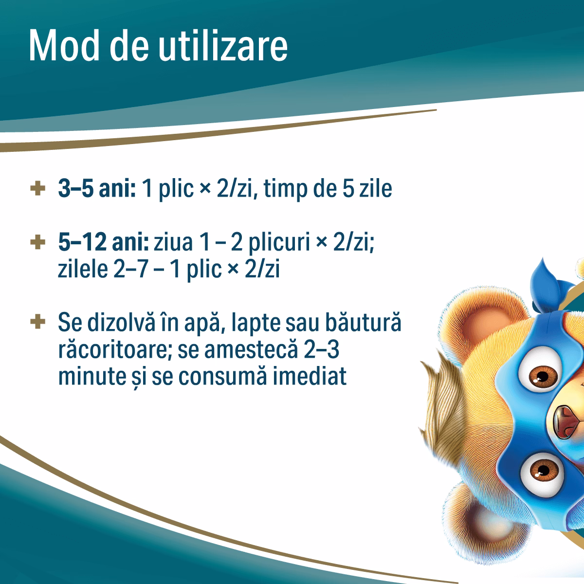 câte 1 plic de 2 ori pe zicopii cu vârsta între 5 – 12 ani, timp de 7 zile: