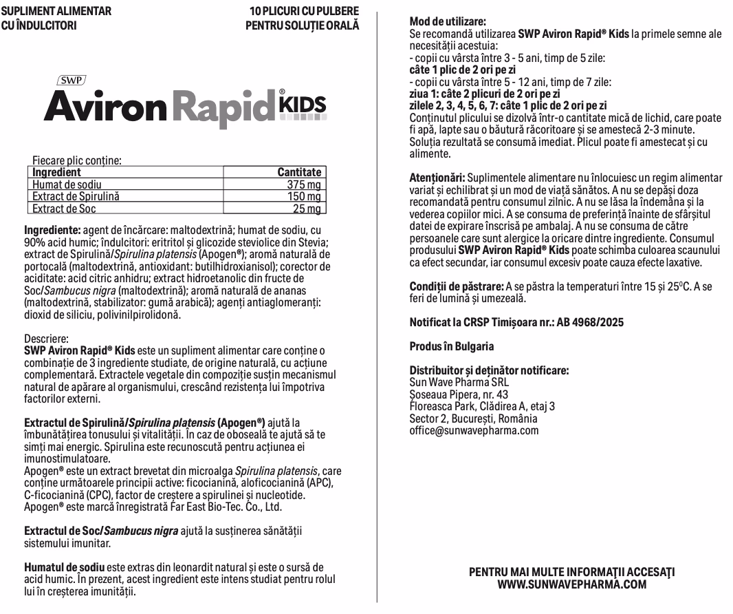 SWP Aviron Rapid® Kids este un supliment alimentar care conține o combinație de 3 ingrediente studiate, de origine naturală, cu acțiune complementara. Extractele vegetale din compoziție susțin mecanismul natural de apărare al organismului, crescând rezistența lui împotriva factorilor externi.