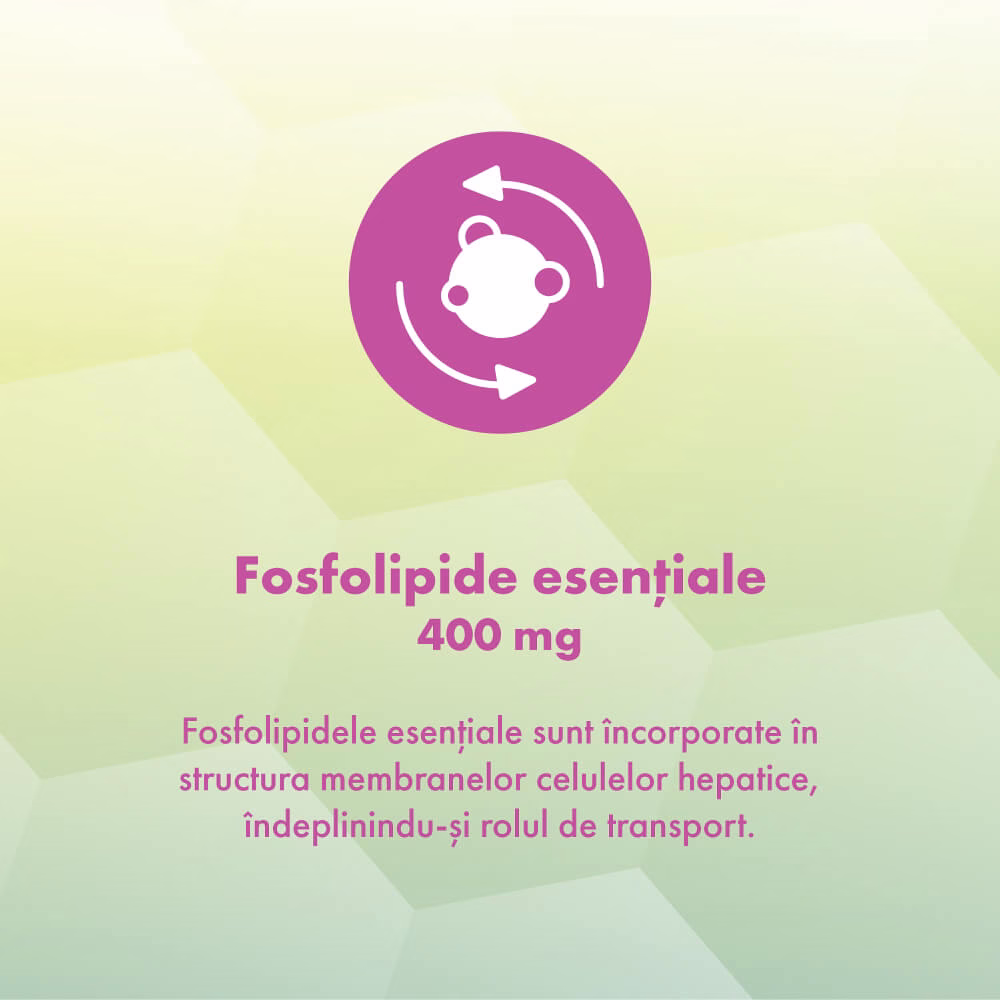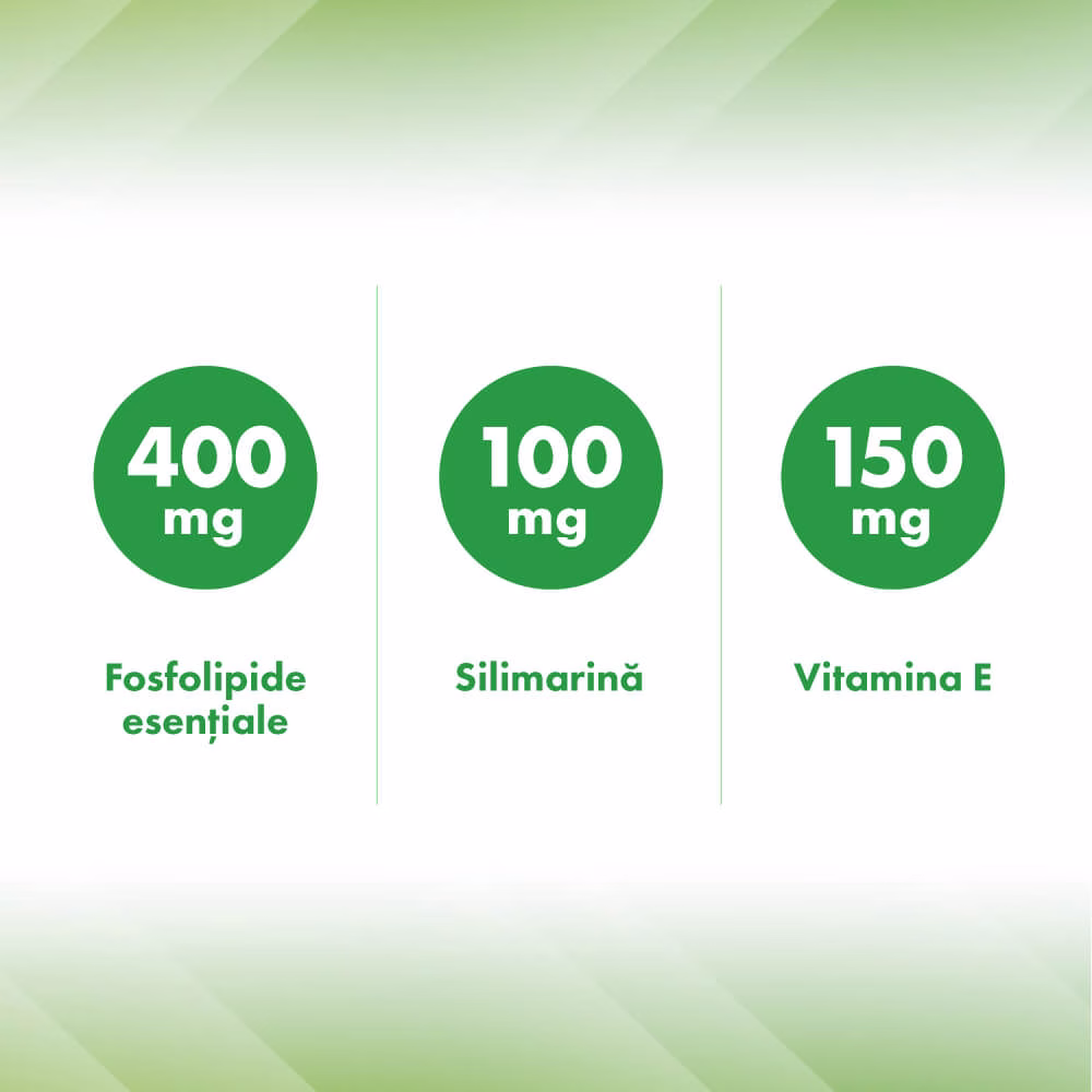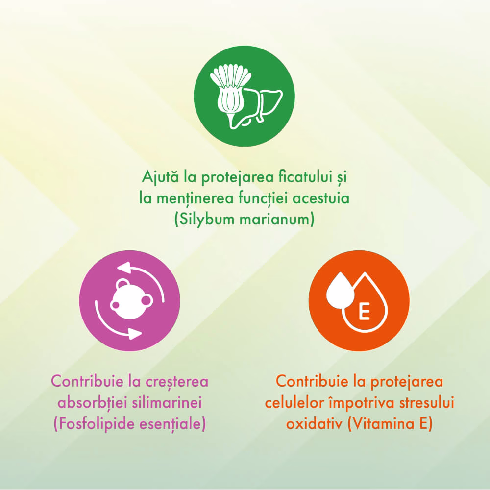 Asocierea fosfolipidelor esențiale cu silimarina, în aceeași capsulă, are avantajul de a contribui la absorbția și biodisponibilitatea silimarinei. Datorită proprietăților chimice, fosfolipidele dețin importante roluri metabolice la nivel celular, inclusiv la nivelul celulei hepatice.