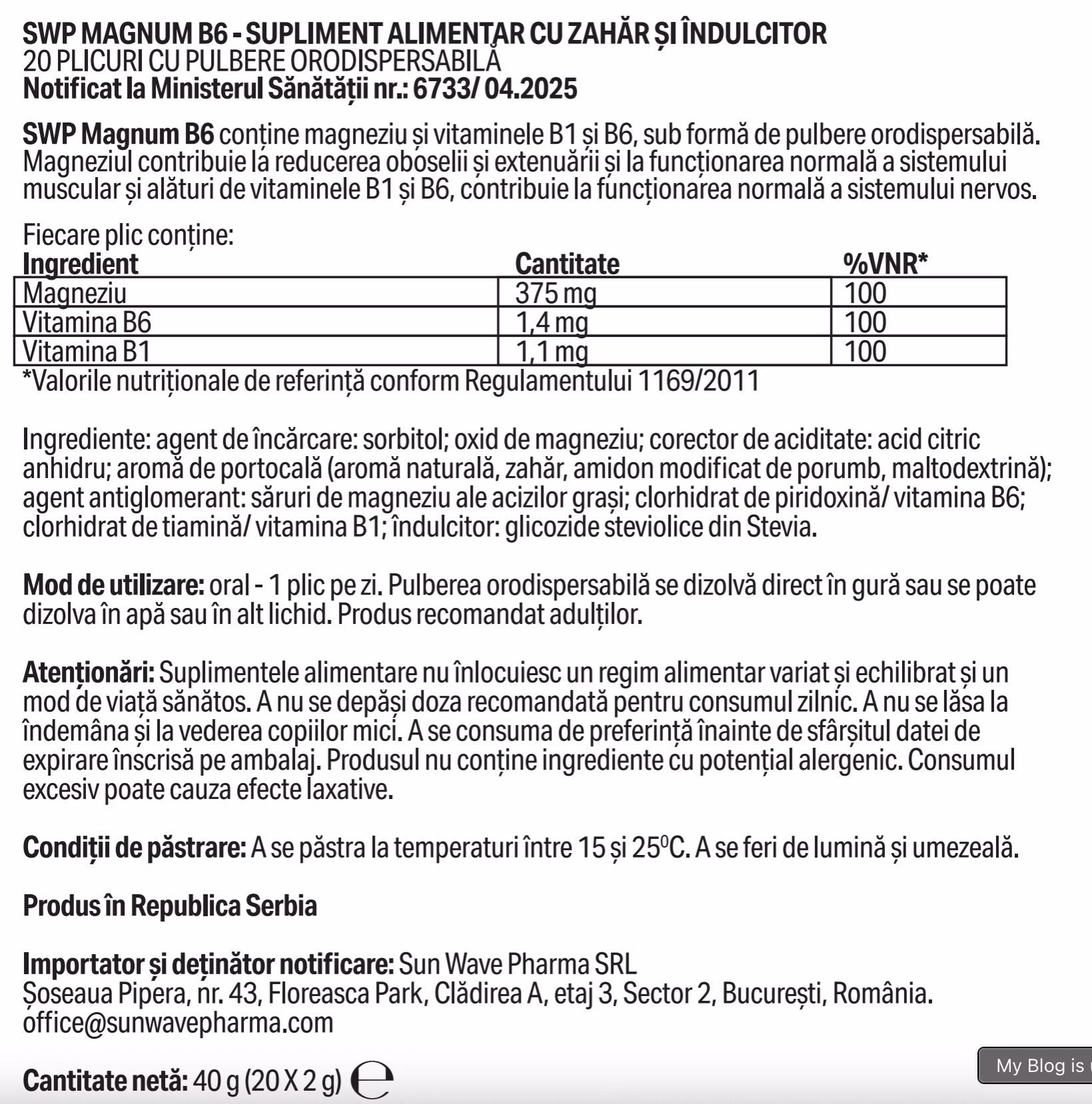 SWP Magnum B6 conține magneziu ambalat în plicuri, fără îndulcitori artificiali, pentru utilizare directă fără lichid. Conține doza zilnică recomandată de magneziu și vitaminele B1 și B6.