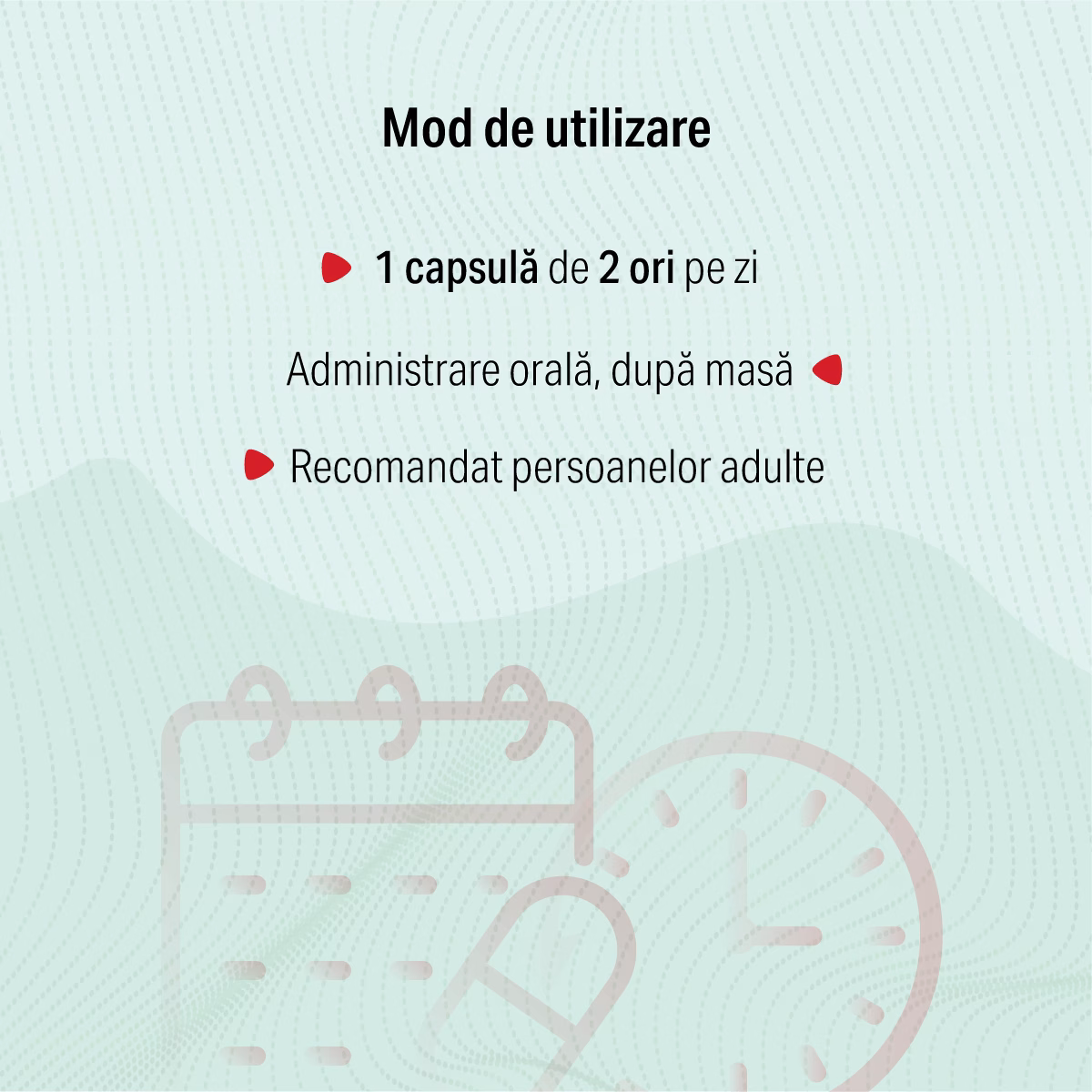 Oral – câte 1 capsulă de 2 ori pe zi. Produsul este recomandat persoanelor adulte.