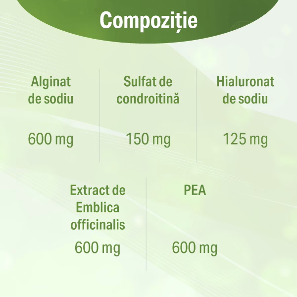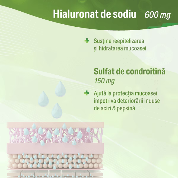 Hialuronatul de sodiu, în asociere cu sulfatul de condroitină, contribuie la susținerea integrității și protecției fiziologice a mucoasei gastro-esofagiene, sprijinind confortul digestiv.